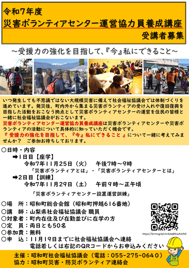 チラシのダウンロードはコチラから➡令和7年度災害ボランティアセンター運営協力員養成講座.PDF