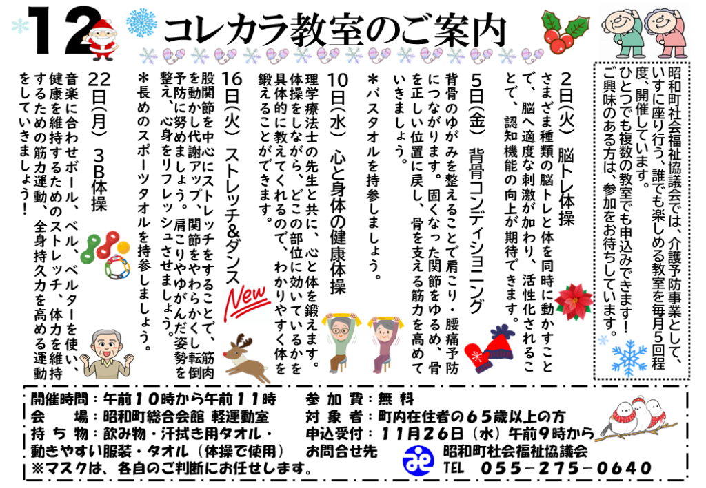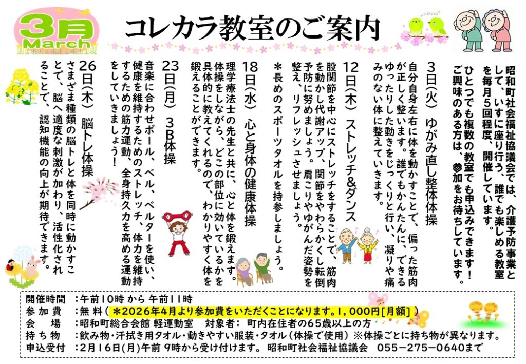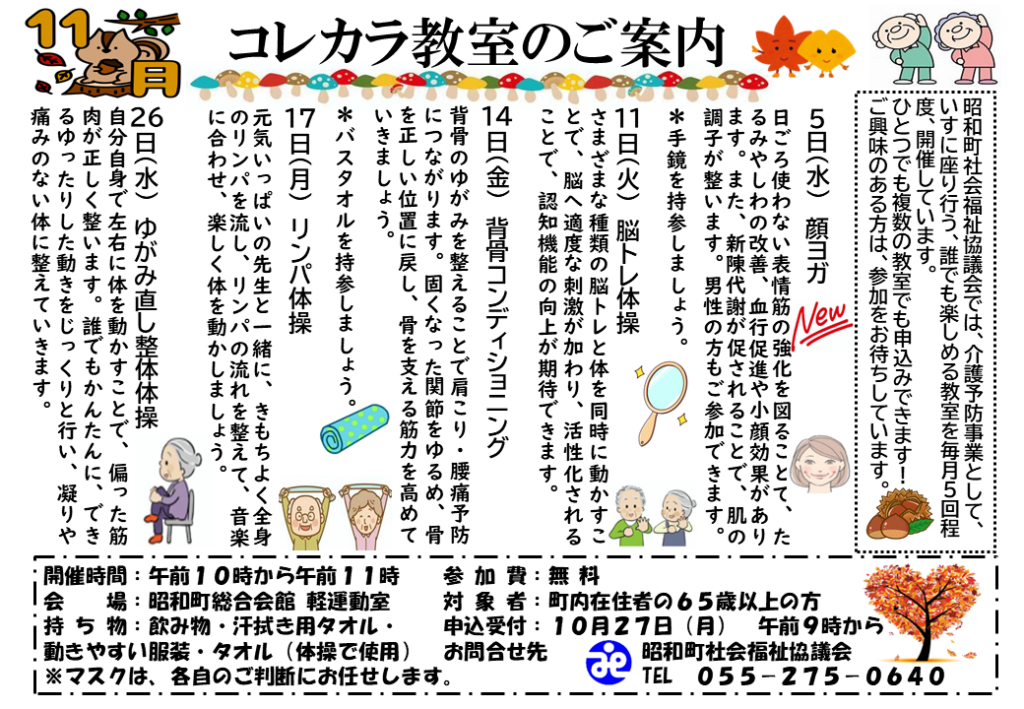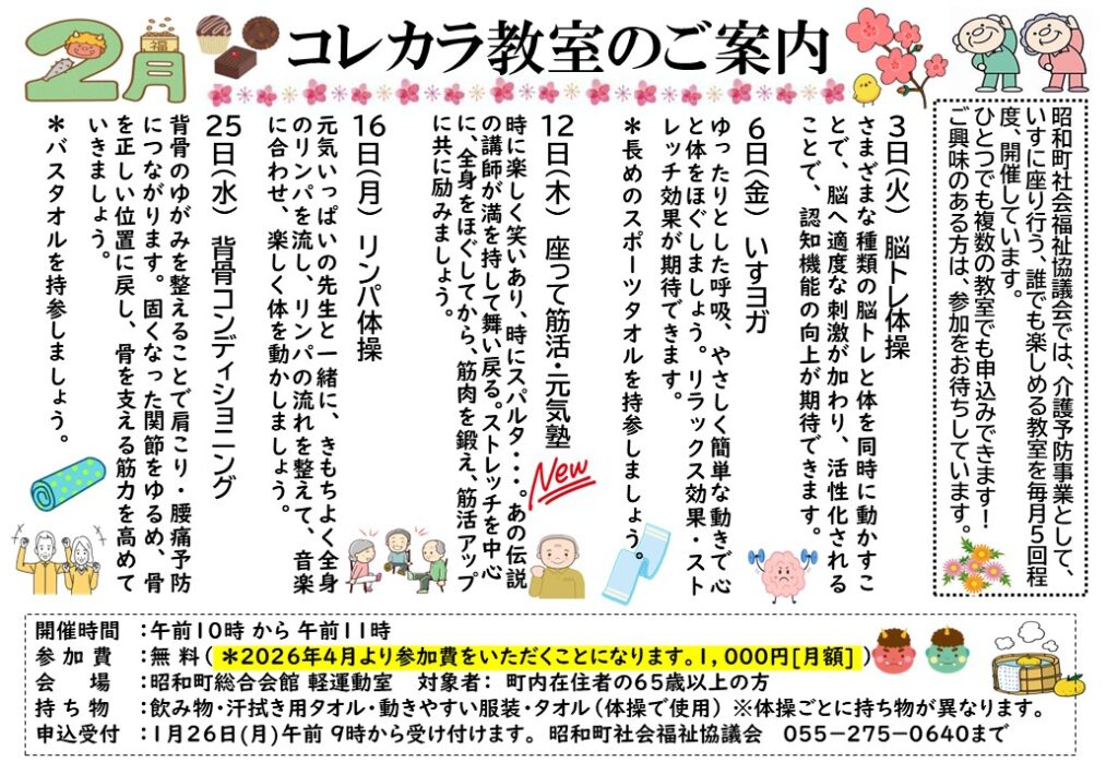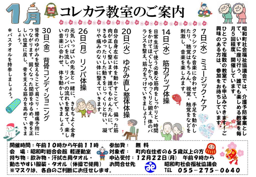 昭和町社会福祉協議会では、昭和町からの介護保険地域支援事業の委託として《コレカラ教室》を開催しています。興味のある教室へ参加して、健康な心と体を維持するためにご利用ください。1つからでも全部でも、お気軽にご参加ください。
