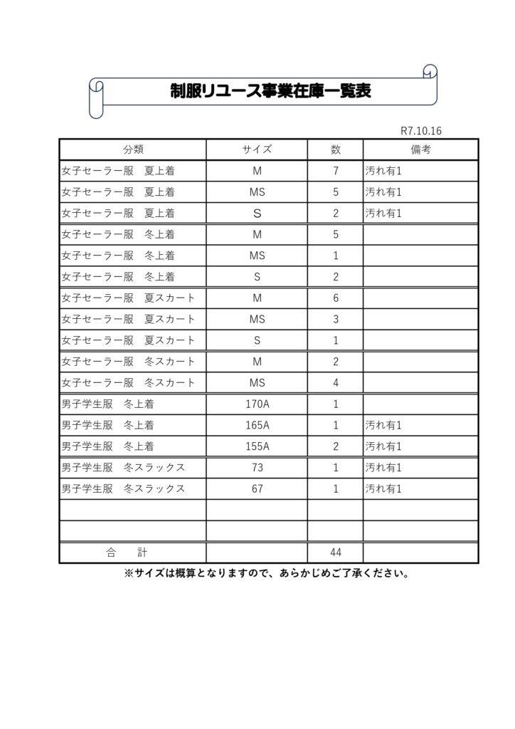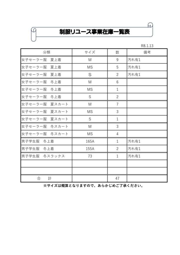 各家庭において子どもの成長や卒業等で不用となった、押原中学校学生服・セーラー服の寄付を受け付けます。 それらを必要とする世帯に譲渡し、子育て世帯の家計負担の軽減ならびに再利用の推進を図ります。